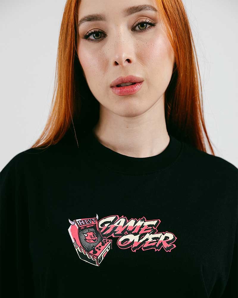 Croptop en tela 100% algodón de 200 gramos y cuello en rib, estampado en plastisol de alta calidad en frente y espalda. (Banderín con logo de la marca en la manga izquierda)