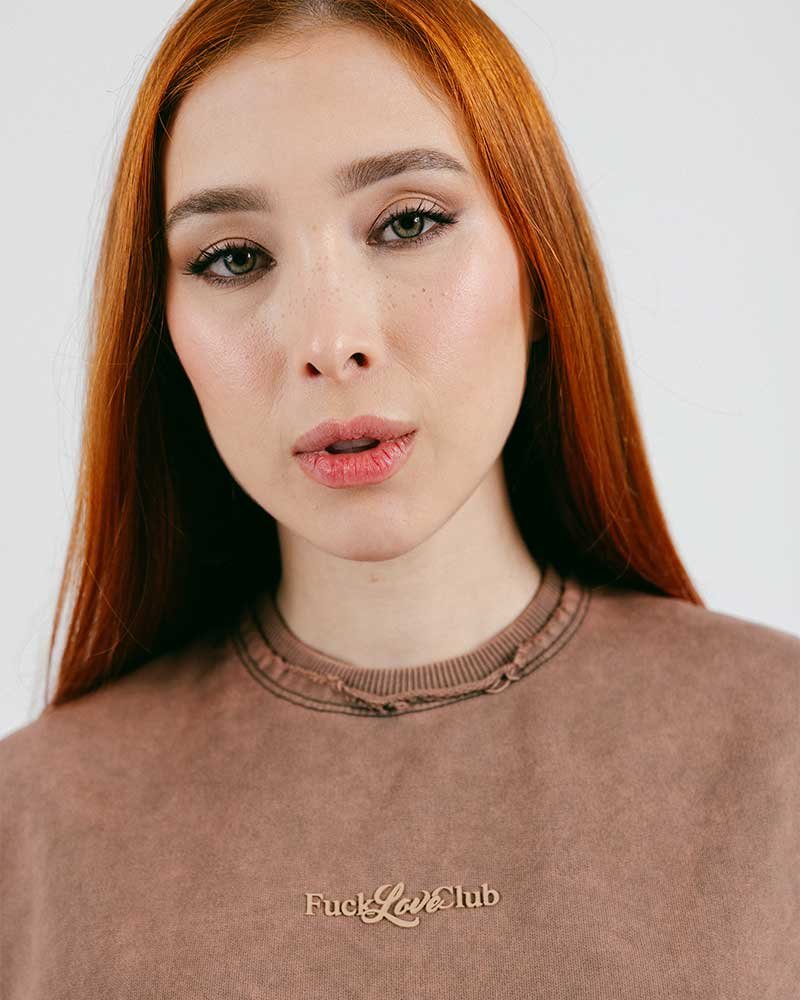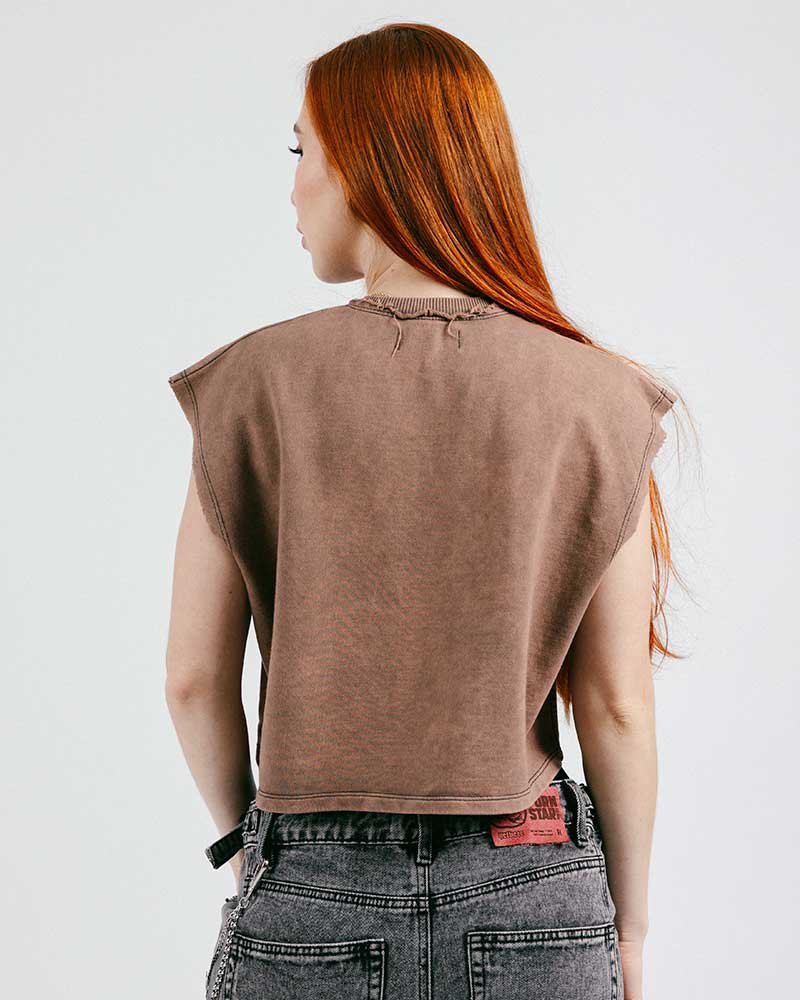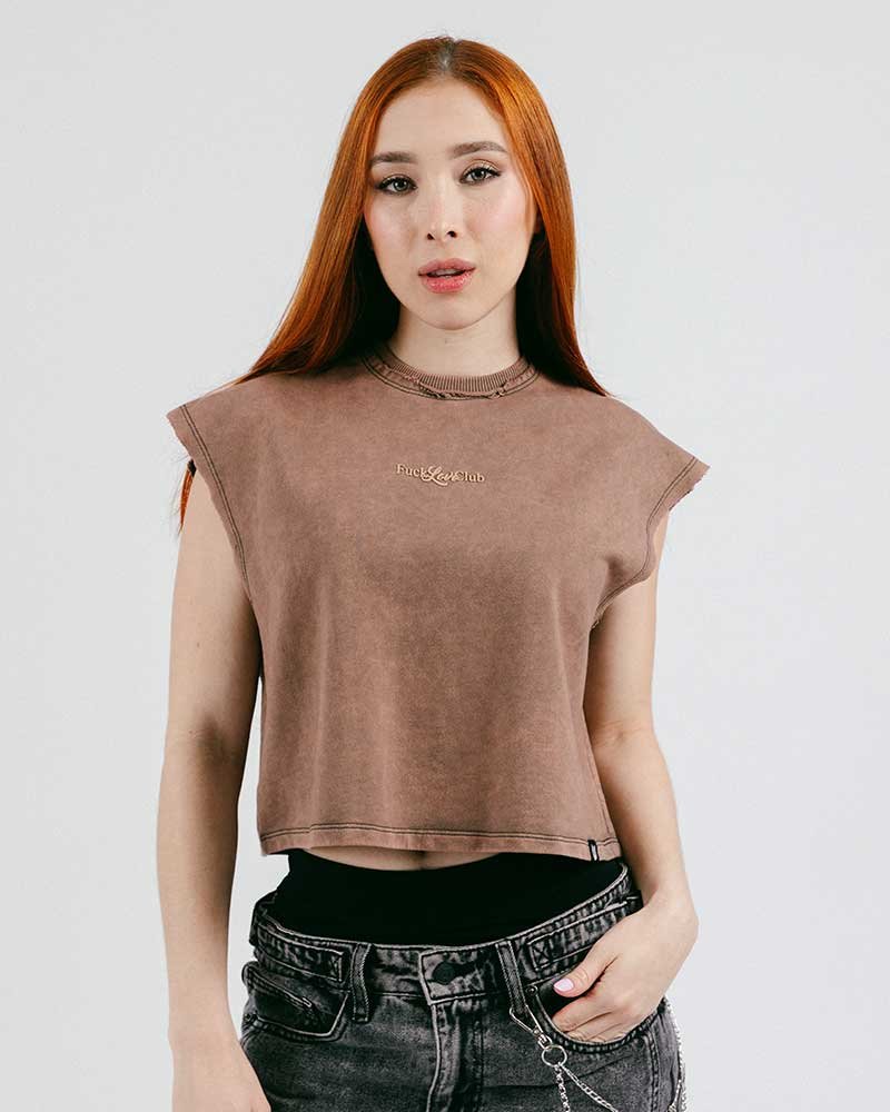 Crop top en tela burda 100% algodón de 280 gramos y cuello en rib. Estampado en plastisol de alta densidad en el frente